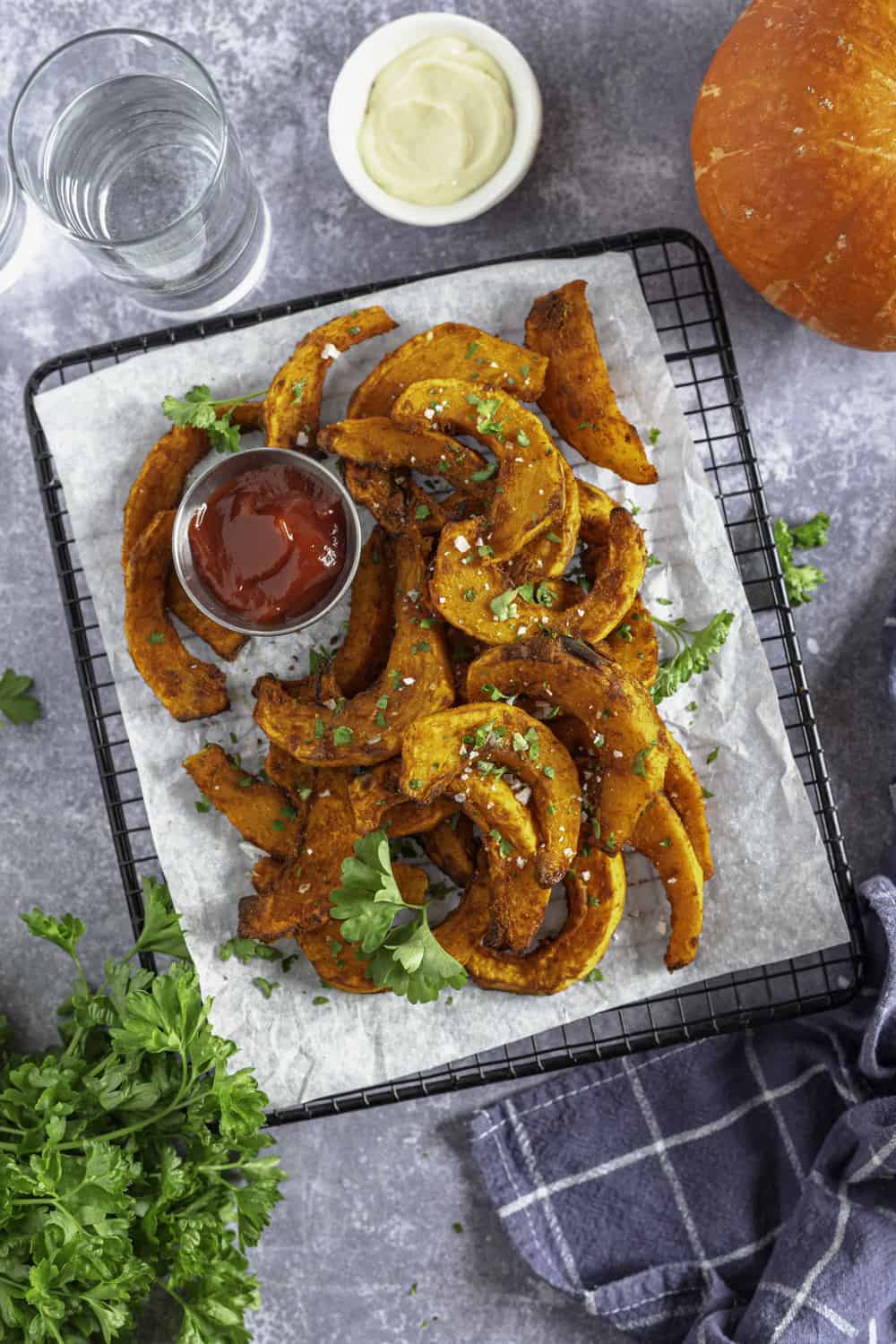 Air fryer pumpkin fries, are savory-sweet and made crispy in the air fryer with a little oil, a baking “pie” pumpkin, and are seasoned just right with cumin, turmeric, and smoked paprika.