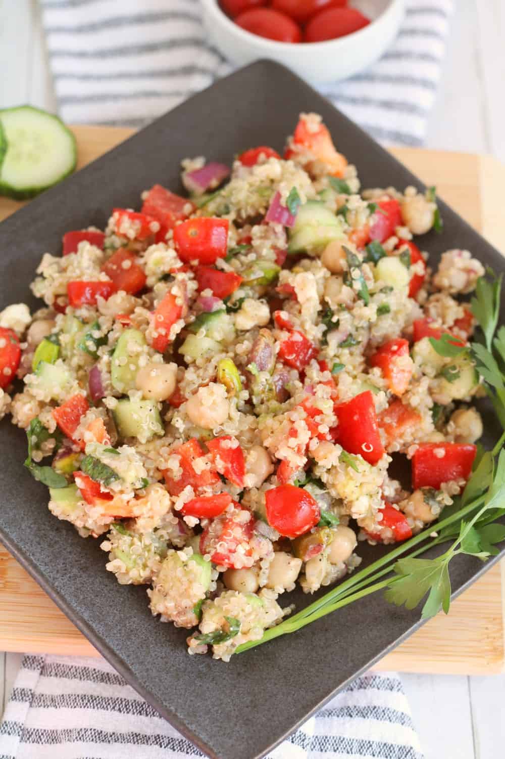 This delightful quinoa salad with chickpeas will tempt your tastebuds with the textures and flavors of cucumber, pickled onions, tomatoes, bell peppers, and more.