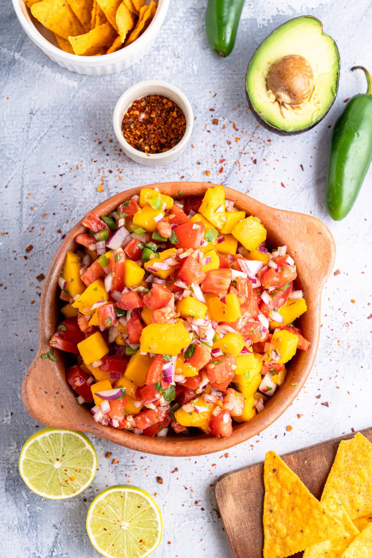 Mango pico de gallo is a sweet and savory mixture of fresh, juicy mangoes, tangy lime juice, spicy jalapenos, and crisp red onions.